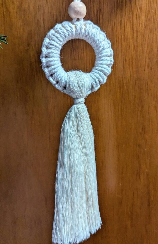 Dieser Anhänger hat eine Gesammtlänge von ca. 21 cm und besteht aus Holzring und beigen Garn